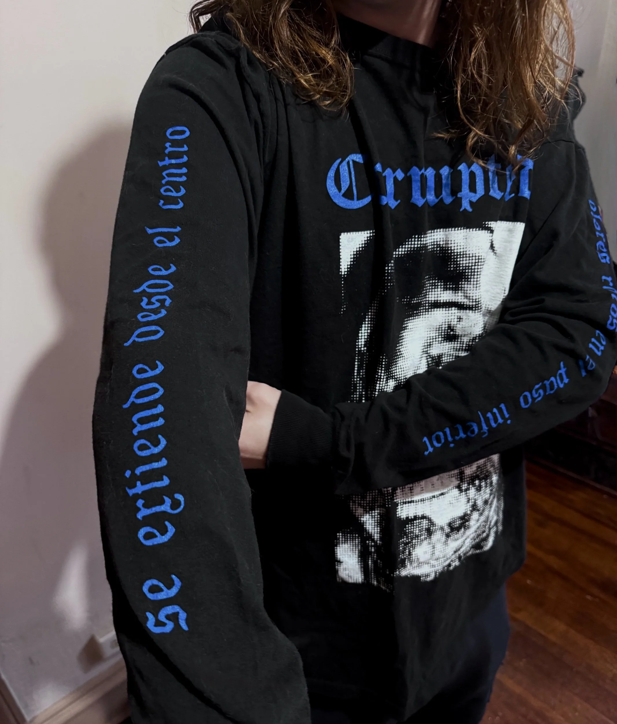 This is a 100% cotton three-sided (front and sleeves) longsleeve tee with Corrupted logo and artwork, including Paso Inferior lyrics on both sleeves. Ink colors and blue and white.